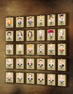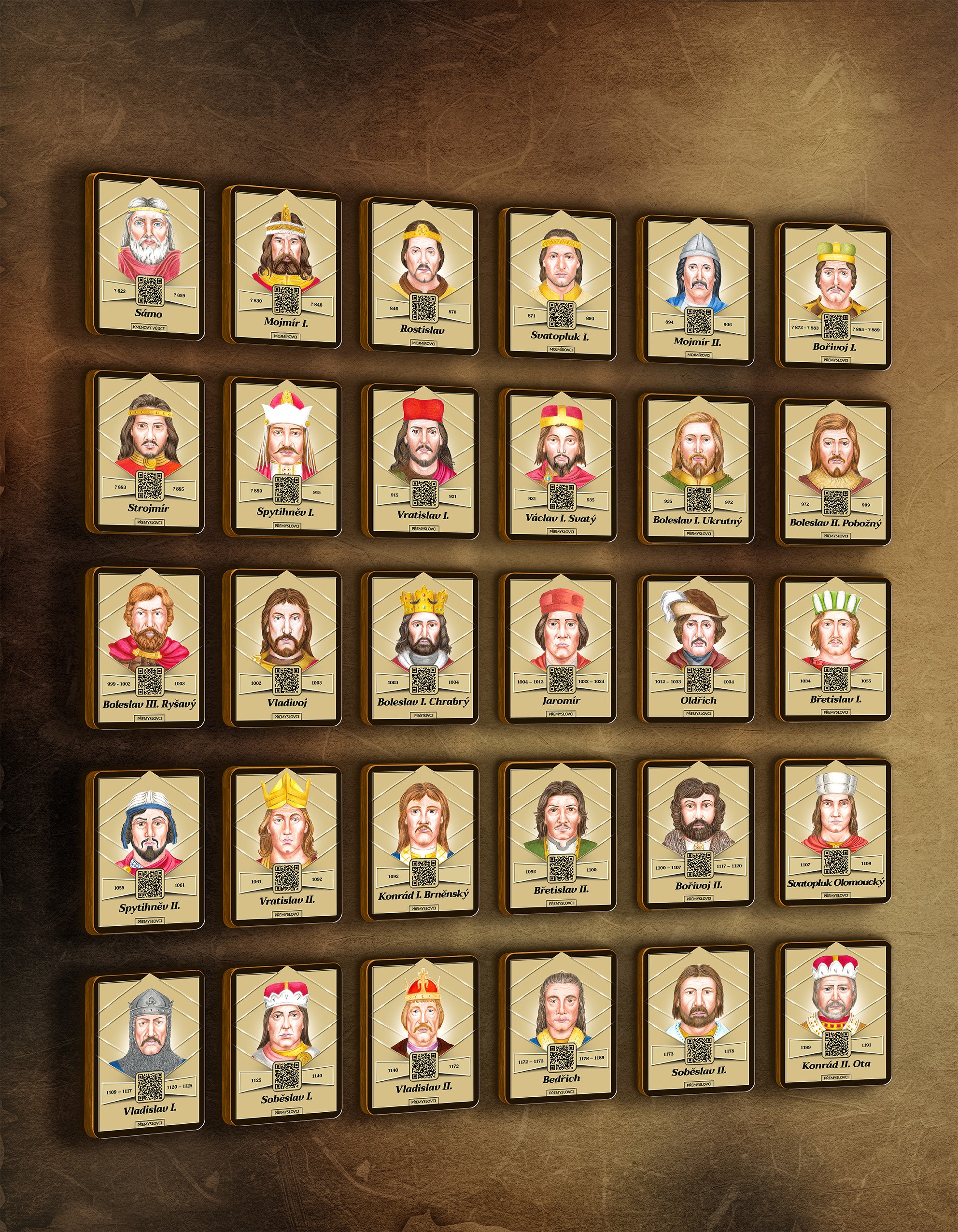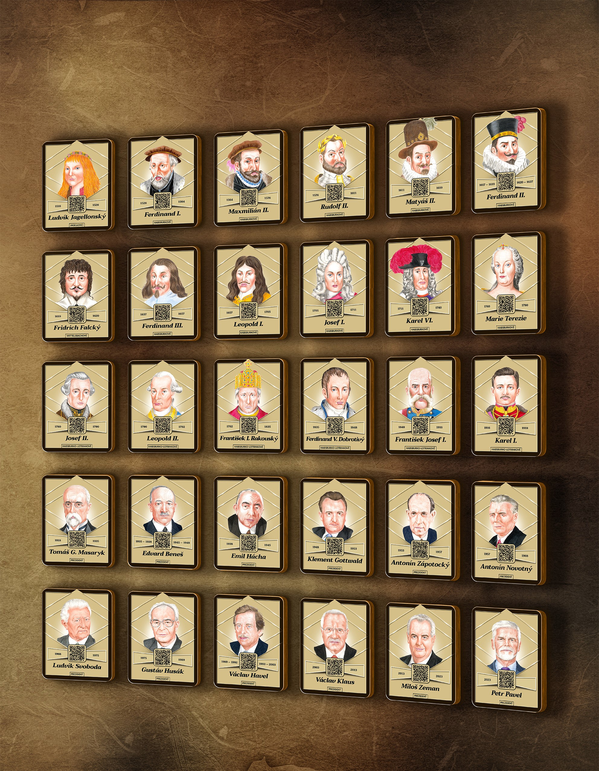 Projekt vychází z unikátního třídílného obrazu s ilustracemi jednotlivých osobností. Každý portrét obsahuje QR kód, který po načtení mobilním telefonem zobrazí podrobnější informace o daném panovníkovi či prezidentovi.